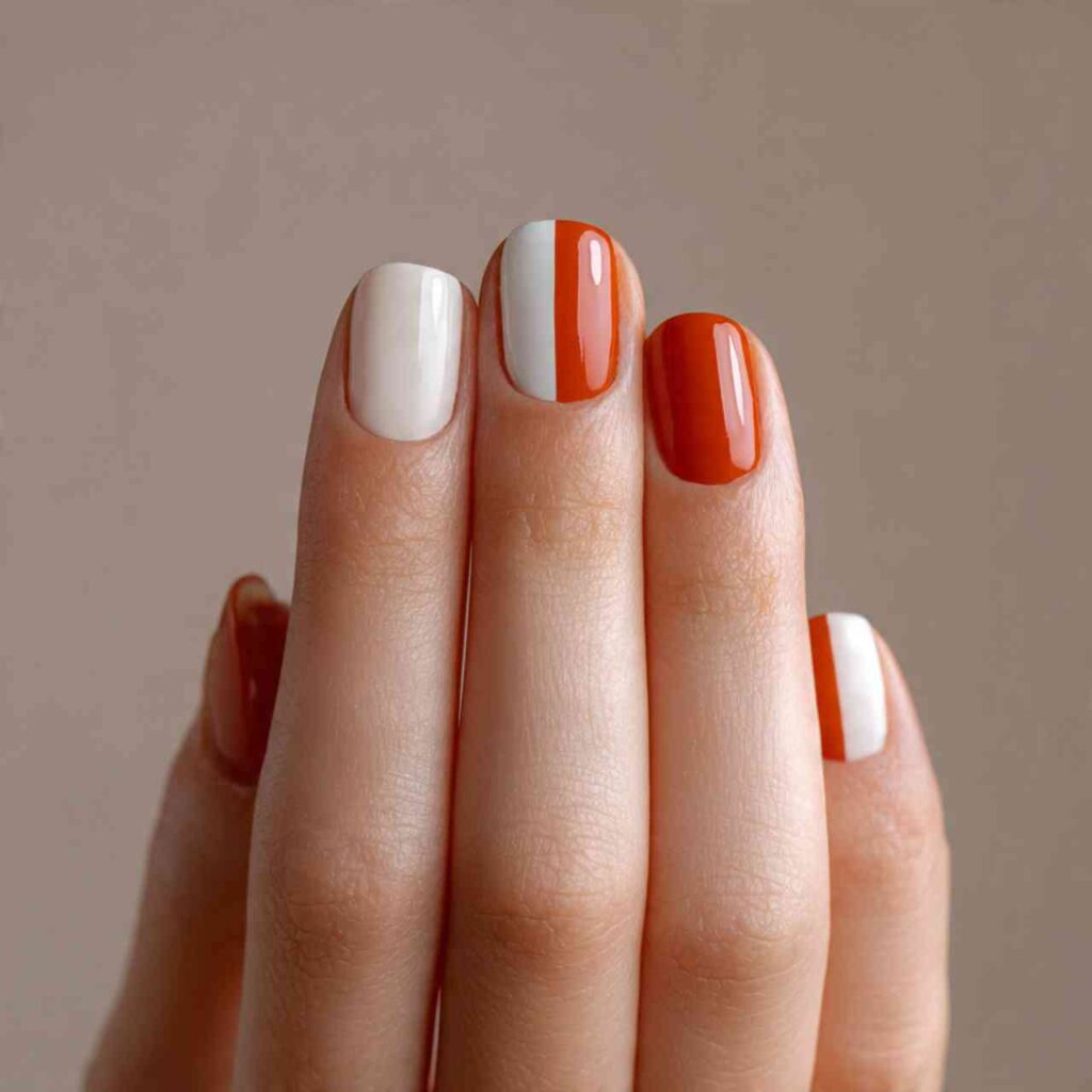 Each nail is divided vertically or diagonally into two contrasting colors. Think cream and terracotta, or sage and ivory for a sophisticated color-blocking effect.