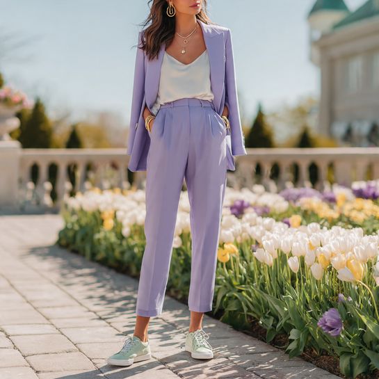 The spring suit gets a fresh update in soft pastel shades. Breaking it up with contrasting sneakers prevents the look from feeling too precious while maintaining its inherent sophistication.