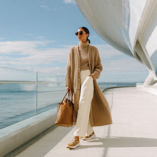 The cardigan-as-outerwear trend continues strong. A longline cardigan worn over tailored trousers creates clean vertical lines, while sleek leather sneakers maintain the streamlined aesthetic without adding bulk.