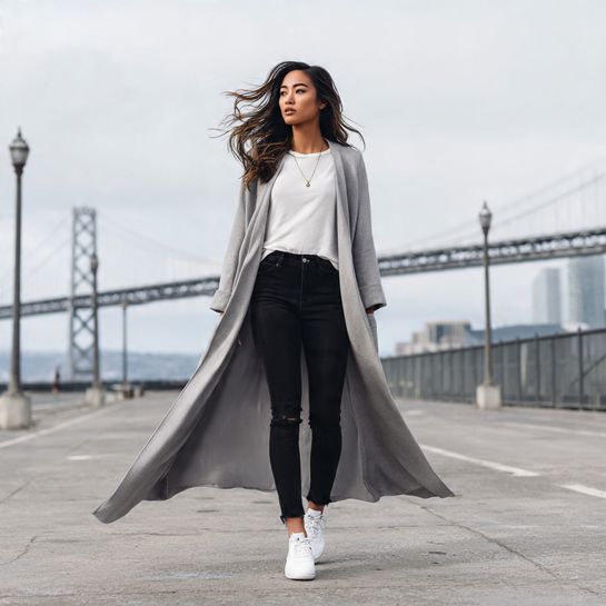 A dramatic duster coat transforms the simplest outfit into something special. Over jeans and a white tee with classic court sneakers, this creates a statement look that’s surprisingly easy to replicate.