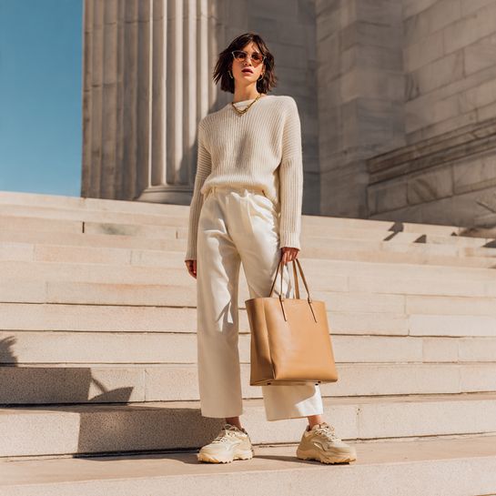 Dressing head-to-toe in varying shades of cream creates a serene, elevated appearance. Platform sneakers in a matching neutral tone add height while maintaining the cohesive color story that makes this outfit feel intentional and refined.