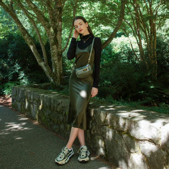 This unexpected layering technique transforms a delicate slip dress into a sophisticated spring outfit. The turtleneck adds coverage and texture, while vintage-inspired sneakers inject personality and make the look walkable for all-day wear.