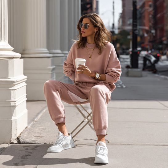 Elevated loungewear has become street-style appropriate, especially in premium fabrics. A matching cashmere set paired with designer sneakers proves that comfort and luxury aren’t mutually exclusive.