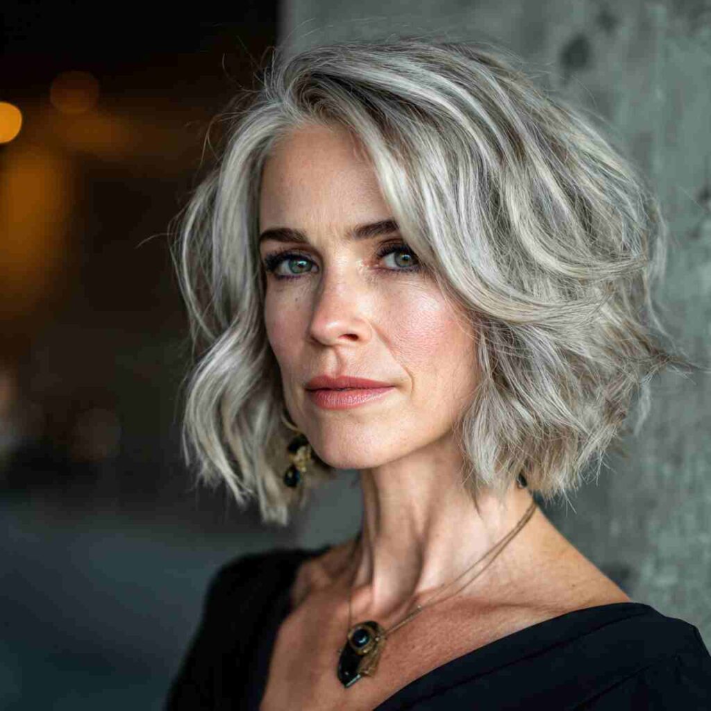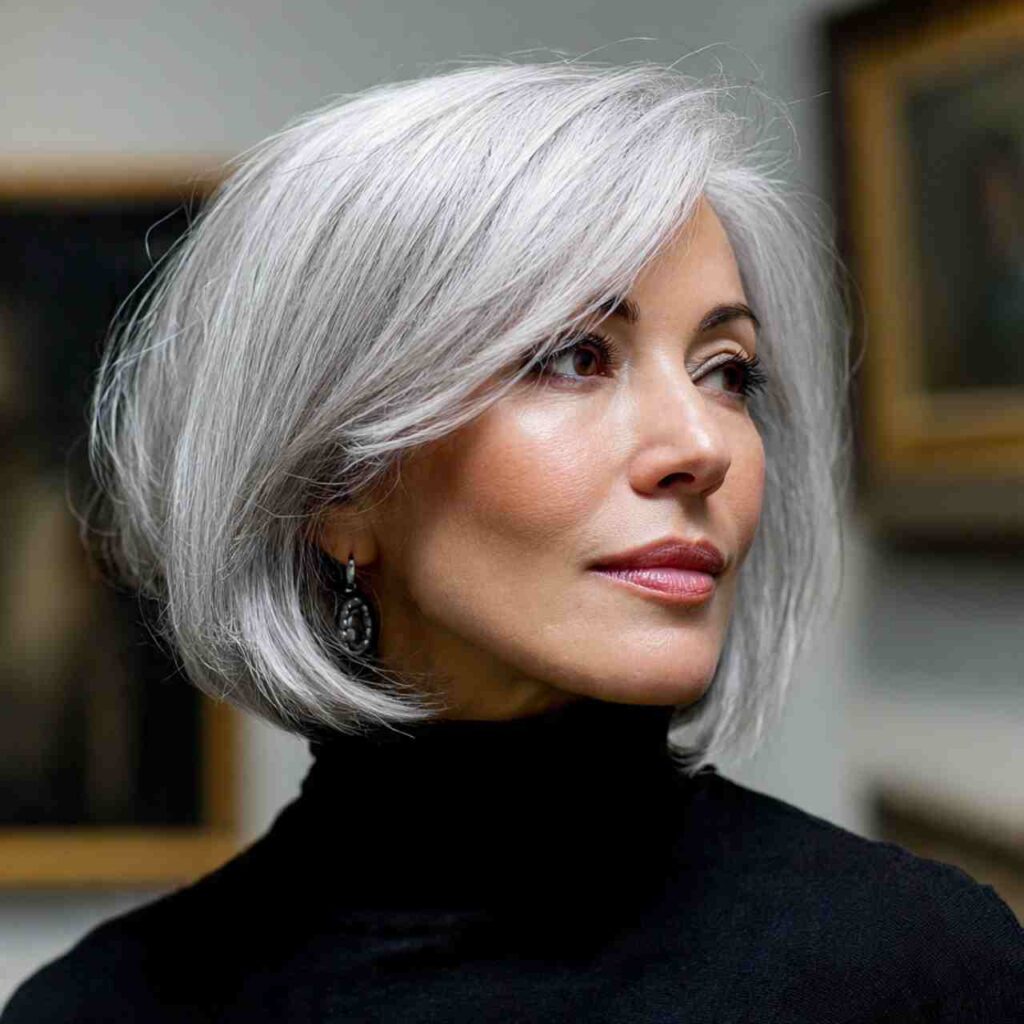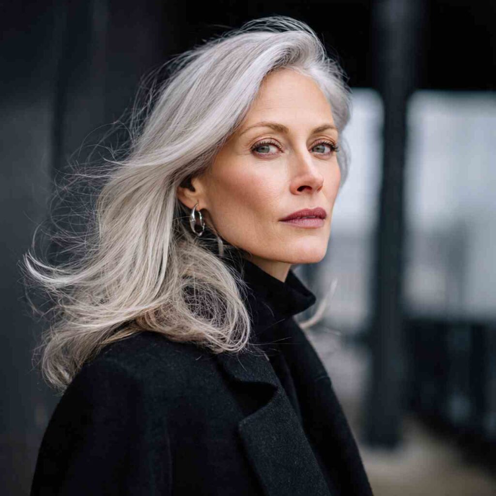 Bold platinum silver embracing fully gray hair creates striking modern elegance. This dramatic choice requires commitment but makes powerful style statement.