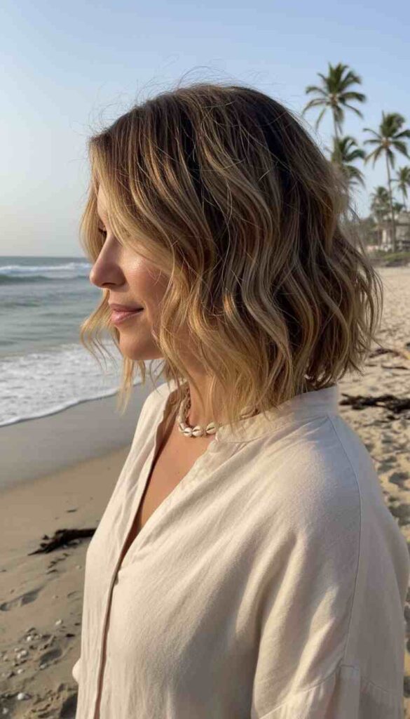 Shoulder-length lob with deeply textured beach waves creating perpetual just-from-ocean aesthetic.