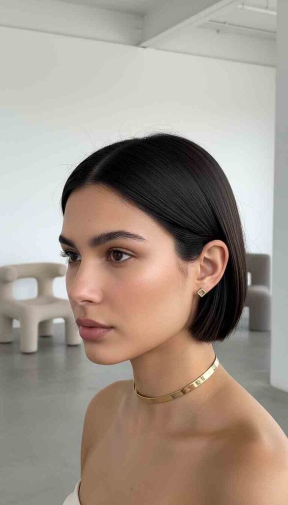 Very short bob cut close to jaw creating bold minimal modern statement.