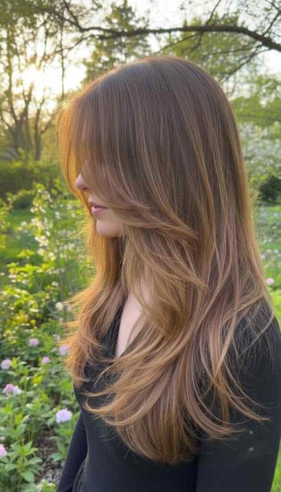 Long hair with invisible internal layers creating movement without visible layer lines.