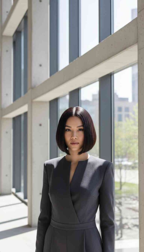 Chin-length bob with power-forward blunt cut creating assertive professional modern statement.