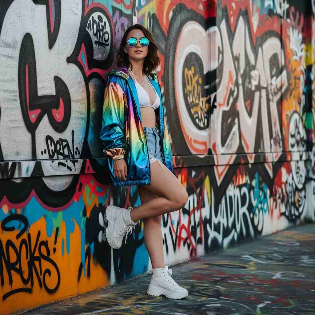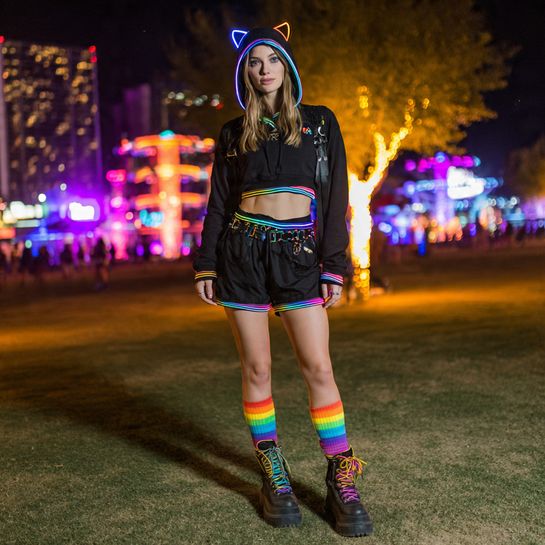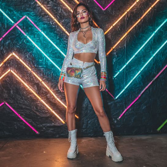 Holographic fabrics reflect light in mesmerizing ways under rave lighting. A matching crop top and shorts set in iridescent silver creates futuristic vibes while platform boots add height and edge.