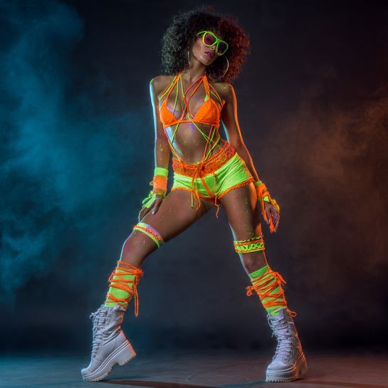 Neon colors glow intensely under blacklights. A supportive rave bra with high-waisted shorts in contrasting neon creates classic rave silhouette with modern flair.