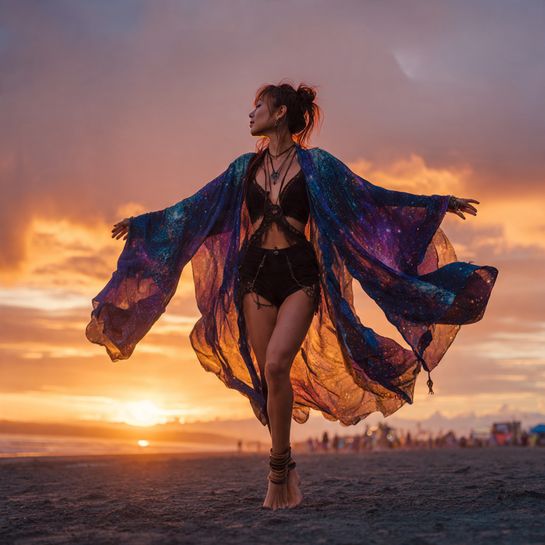 Flowing kimonos add dramatic movement. Sheer or sequined versions over minimal rave wear create beautiful silhouettes while providing sun protection.
