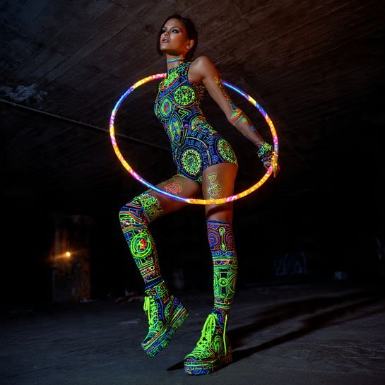 Minimal clothing with maximum UV-reactive body paint. This artistic approach transforms your body into a canvas that glows under blacklight.