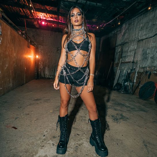 Body chains and harnesses add structural interest. Over simple black sports bra and shorts, they create dimension and edge without restricting movement.
