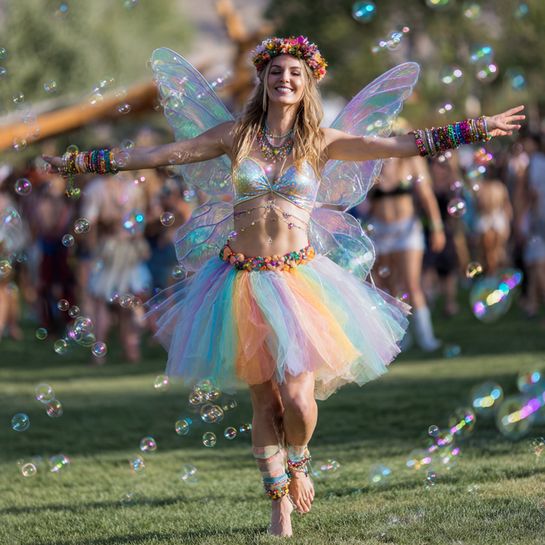 Kandi culture meets ethereal fairy vibes. Pastel tulle, iridescent wings, and colorful bead jewelry create magical, whimsical energy.