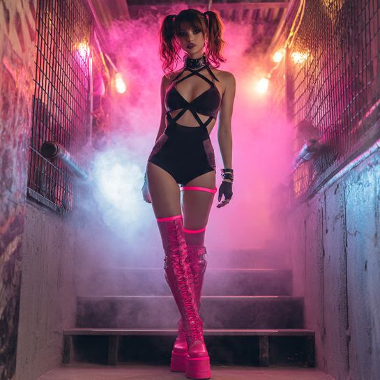 Strategic cutouts add edge while maintaining coverage. Thigh-high boots elongate legs and add dominatrix-inspired power to rave aesthetics.