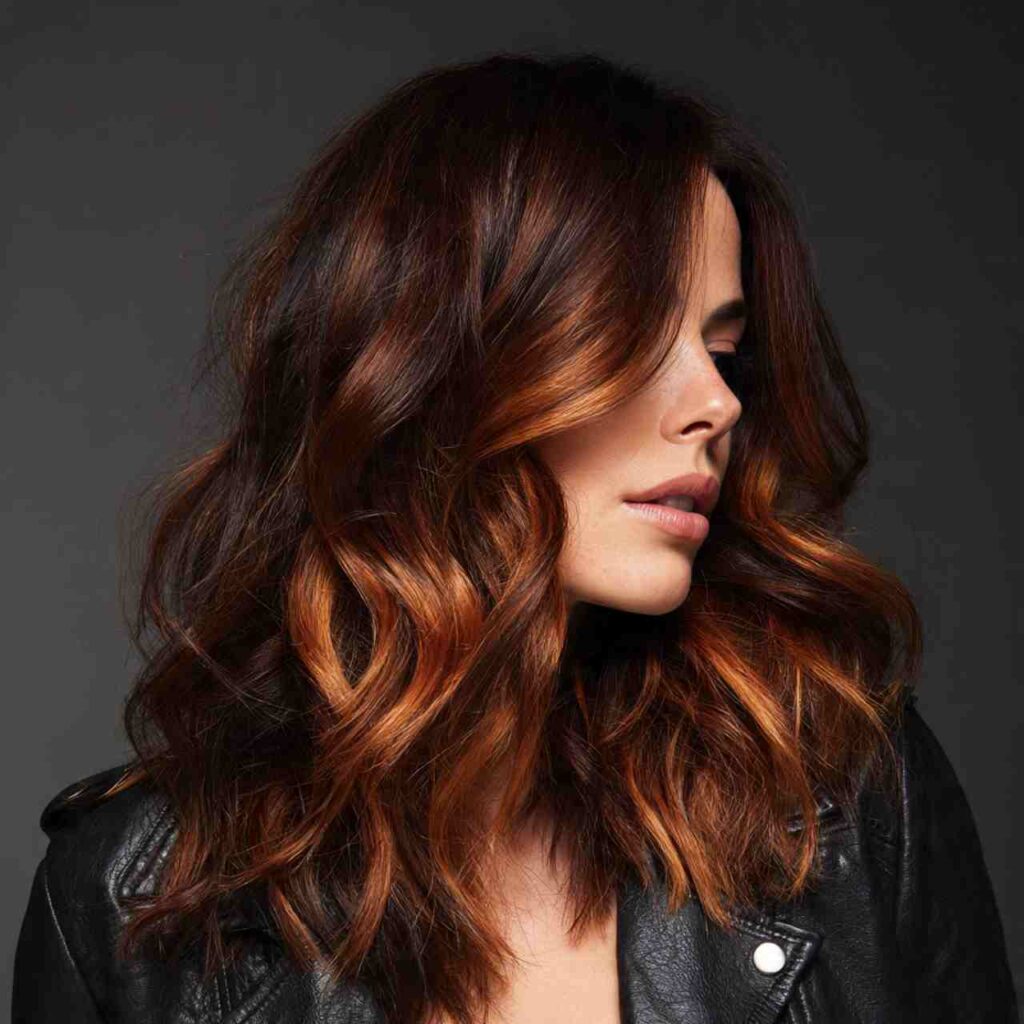Hand-painted copper tones through dark brown hair creates fire-like dimension. This dramatic technique adds personality while remaining wearable.
