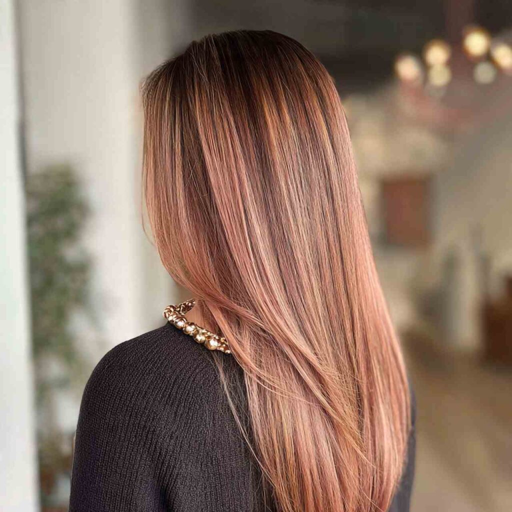 Brown base with rose gold tones creates trendy warmth with metallic shimmer. This modern shade combines warmth with contemporary color trends.