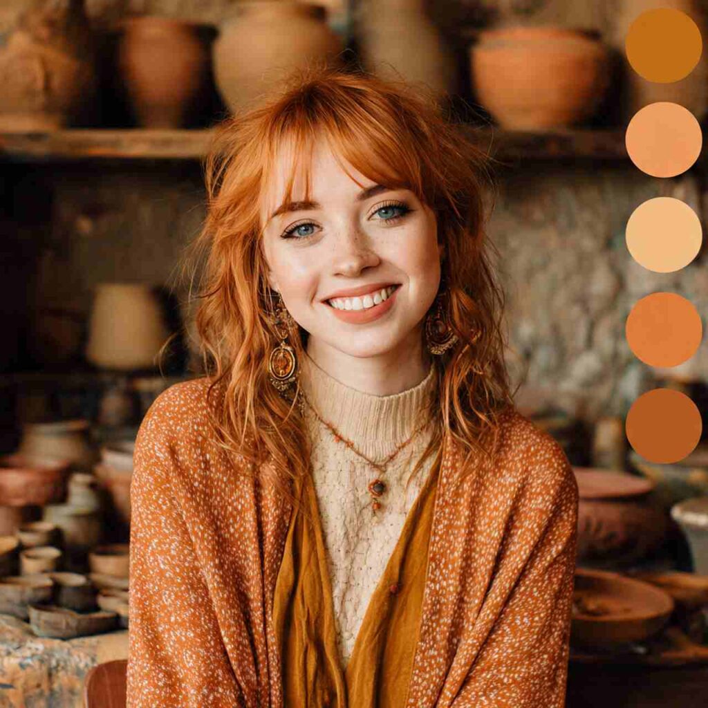 Orange-brown copper reminiscent of terracotta pottery creates earthy warmth. This unique shade works beautifully with autumn-into-winter wardrobes.