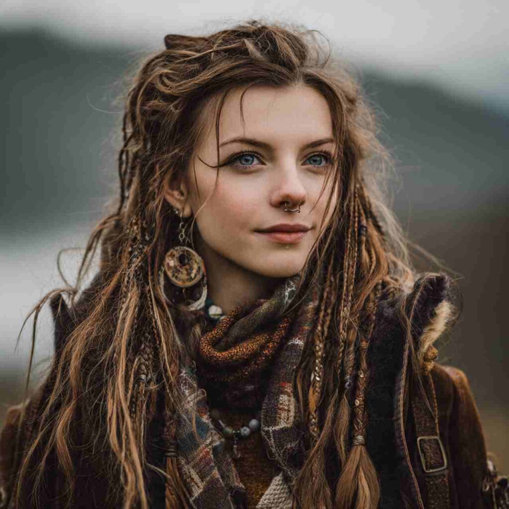 Several small braids interspersed throughout loose hair create textural interest. This bohemian approach adds dimension without full commitment.