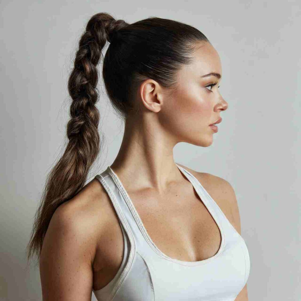 A sleek ponytail with the length braided creates polished athletic style. The combination offers security with elegant finish.