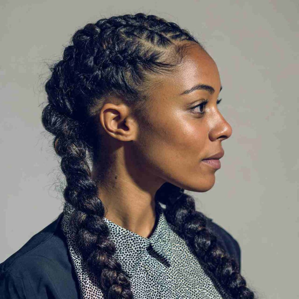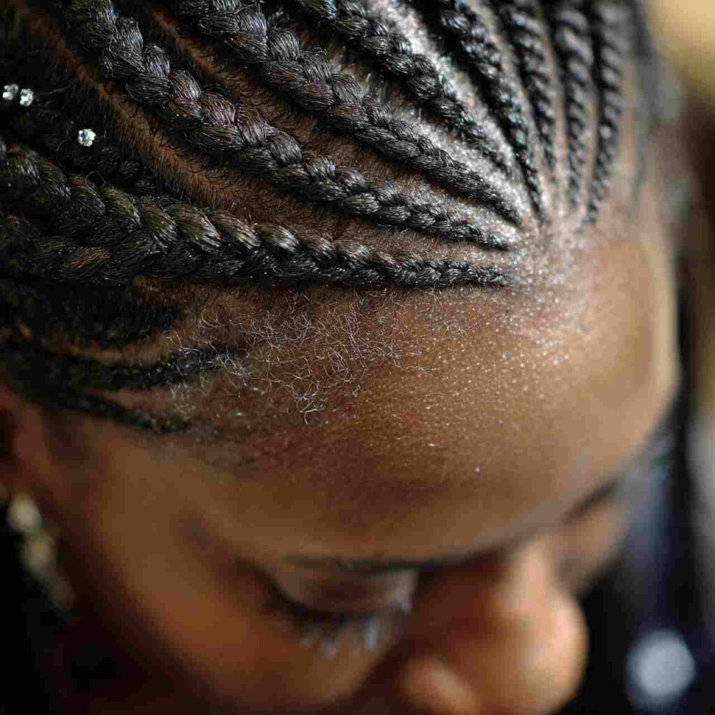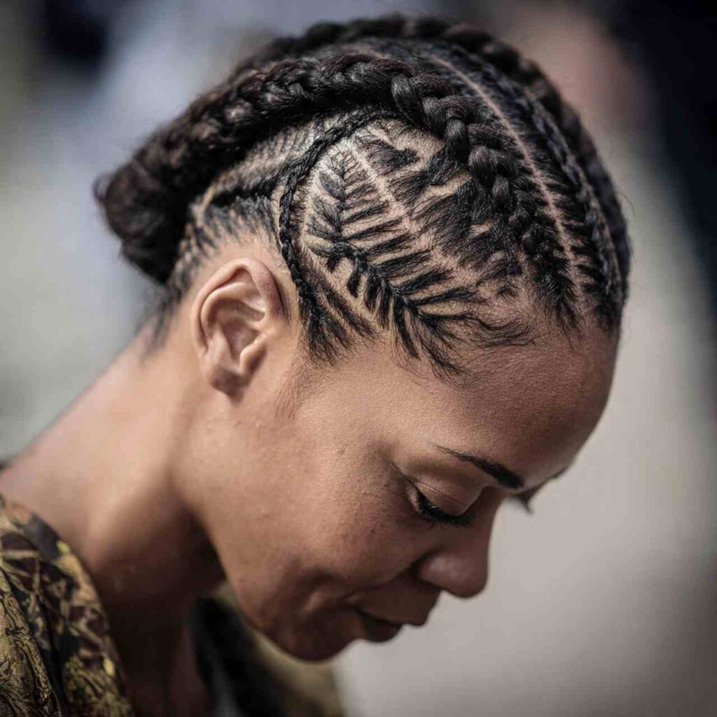 Cornrows braided in creative patterns close to scalp creates cultural traditional styling. These protective styles celebrate heritage and artistry.
