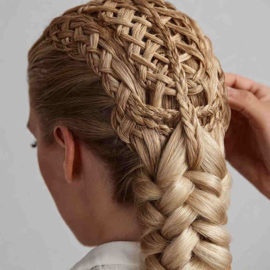 A braid with woven ribbon-like effect creates ladder appearance. This advanced technique delivers striking visual impact.