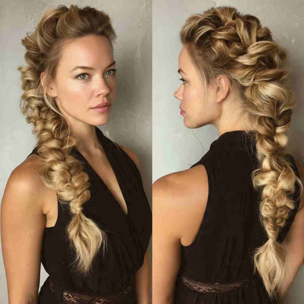 Center section braided standing upward creating mohawk-inspired style. The edgy look combines punk aesthetic with braiding technique.