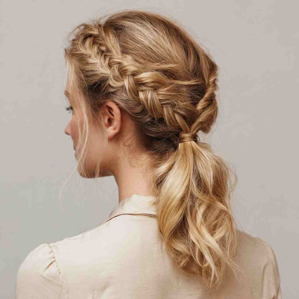 A French braid transitioning into ponytail combines structured and flowing elements. This versatile style works across settings.