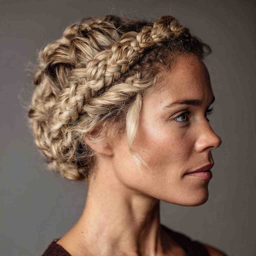 A traditional French braid wrapped around the head creates elegant crown effect. This sophisticated style keeps hair completely secured while looking polished and intentional.