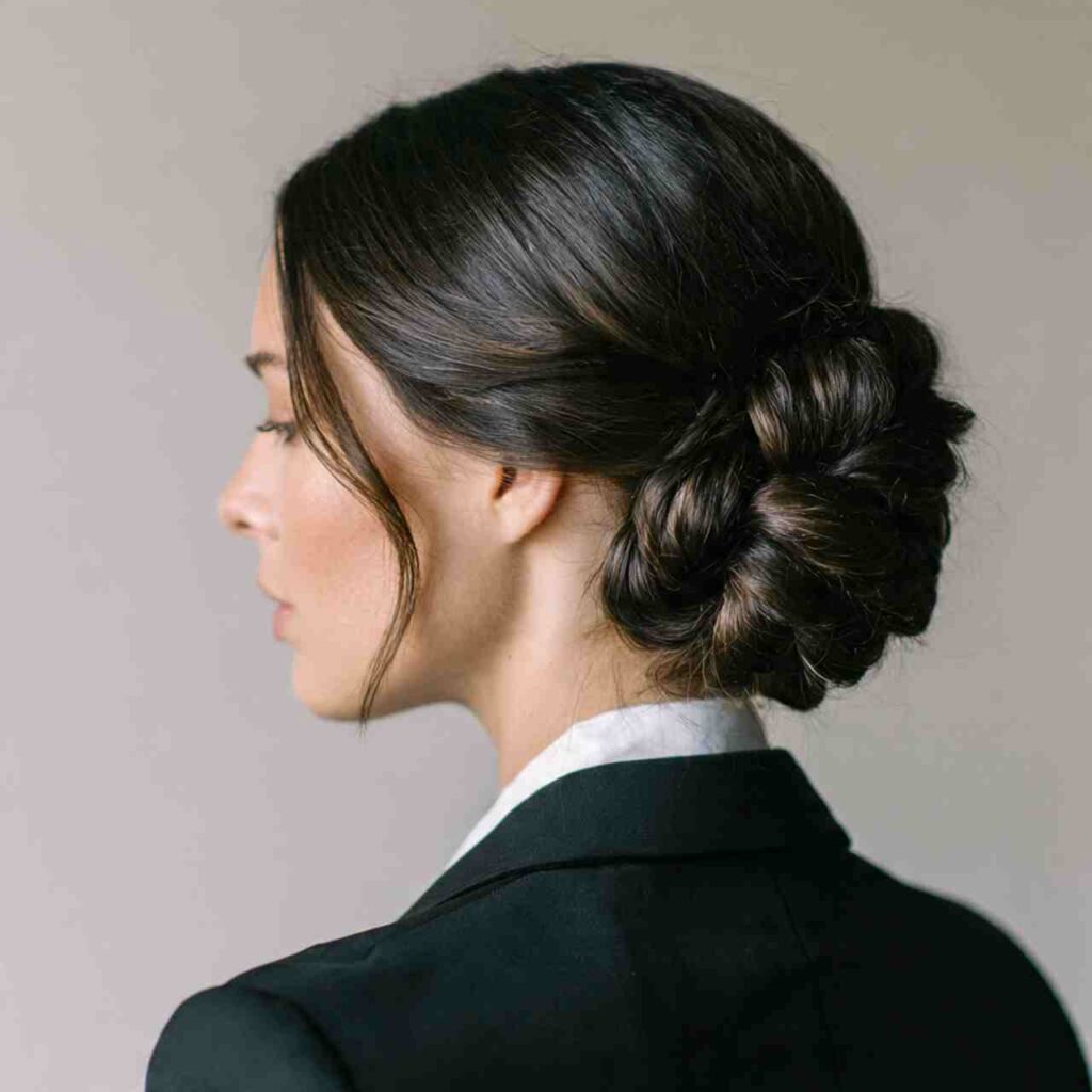 A braid wrapped into a low bun combines two classic styles. This elegant updo works beautifully for professional and formal settings.