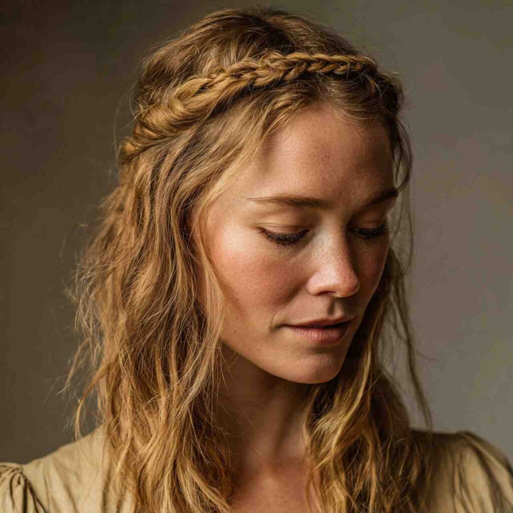 A braid crown around hairline with remaining hair flowing loose creates princess aesthetic. This half-up style combines security with flowing femininity.