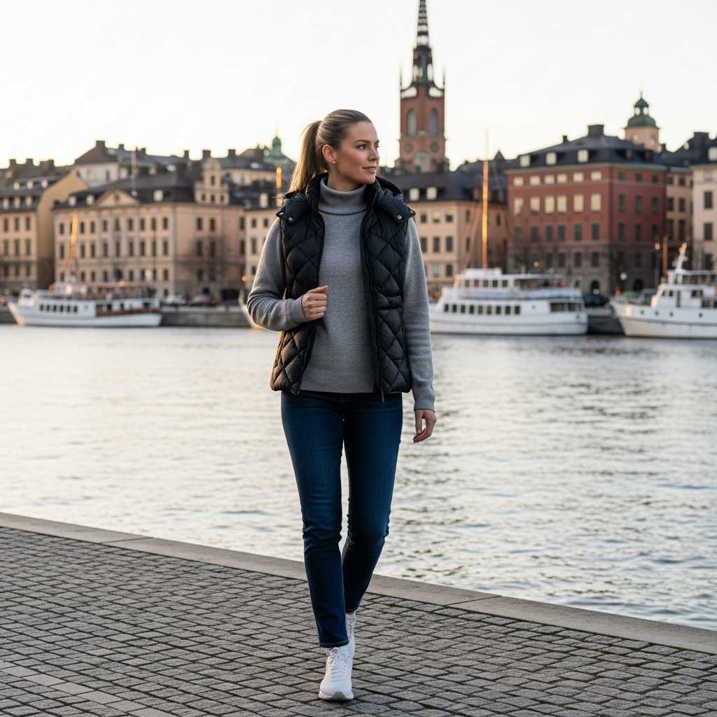 Select a vest with a flattering cut that nips slightly at the waist. The quilted texture adds visual interest while the black shade keeps it versatile. Layer it over chunky sweaters with jeans for weekend errands, or wear it with a turtleneck and trousers for a contemporary casual-professional look that’s uniquely European.