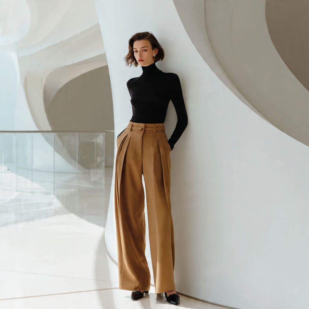 Select trousers with a high waist to balance the wide leg, and ensure the hem hits at the perfect length for your preferred footwear. The camel shade works beautifully with cream, black, chocolate brown, and burgundy. Pair them with fitted turtlenecks or silk blouses, add a tucked-in belt for definition, and complete with ankle boots or loafers.