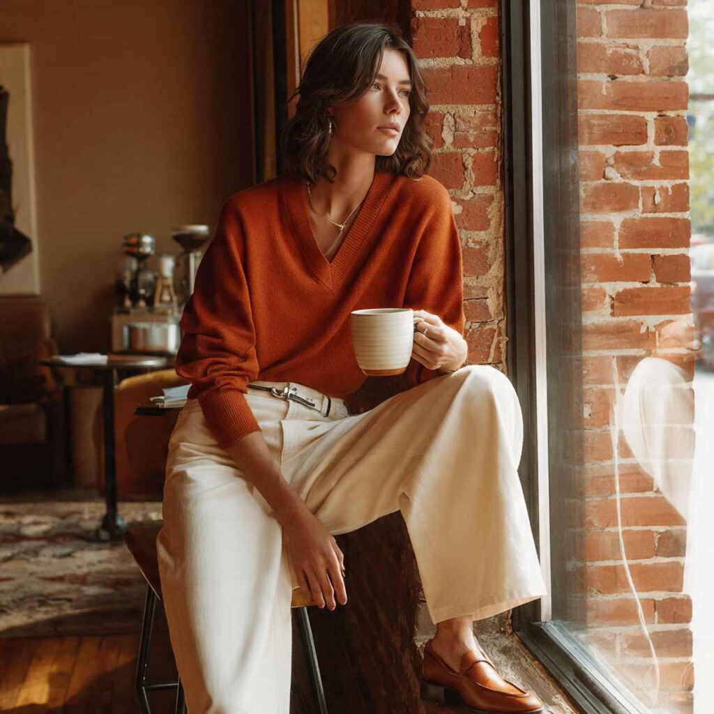 While neutrals dominate European capsule wardrobes, a single warm color adds personality and prevents monotony. Rust orange brings autumnal richness that feels sophisticated rather than bright. A merino wool v-neck in this shade becomes your go-to when neutral outfits need subtle elevation.