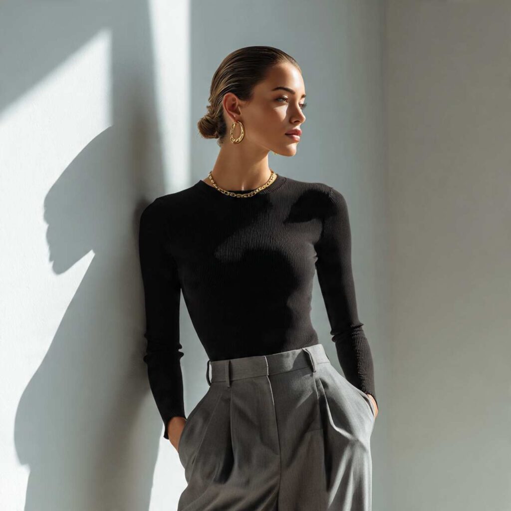 The bodysuit solves the eternal problem of shirts untucking, providing sleek layering and standalone versatility. A black ribbed long-sleeve version offers subtle texture while maintaining the streamlined silhouette that European style favors. This foundation piece works harder than any regular top.