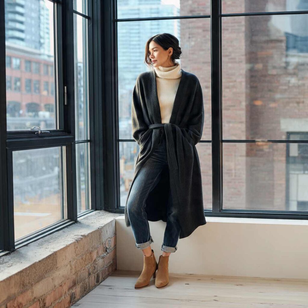 The longline cardigan extends past the hips, creating vertical lines that elongate the silhouette while providing substantial warmth. A charcoal version offers versatility that works as an alternative to blazers and coats for indoor layering. This piece bridges the gap between comfort and structure.
