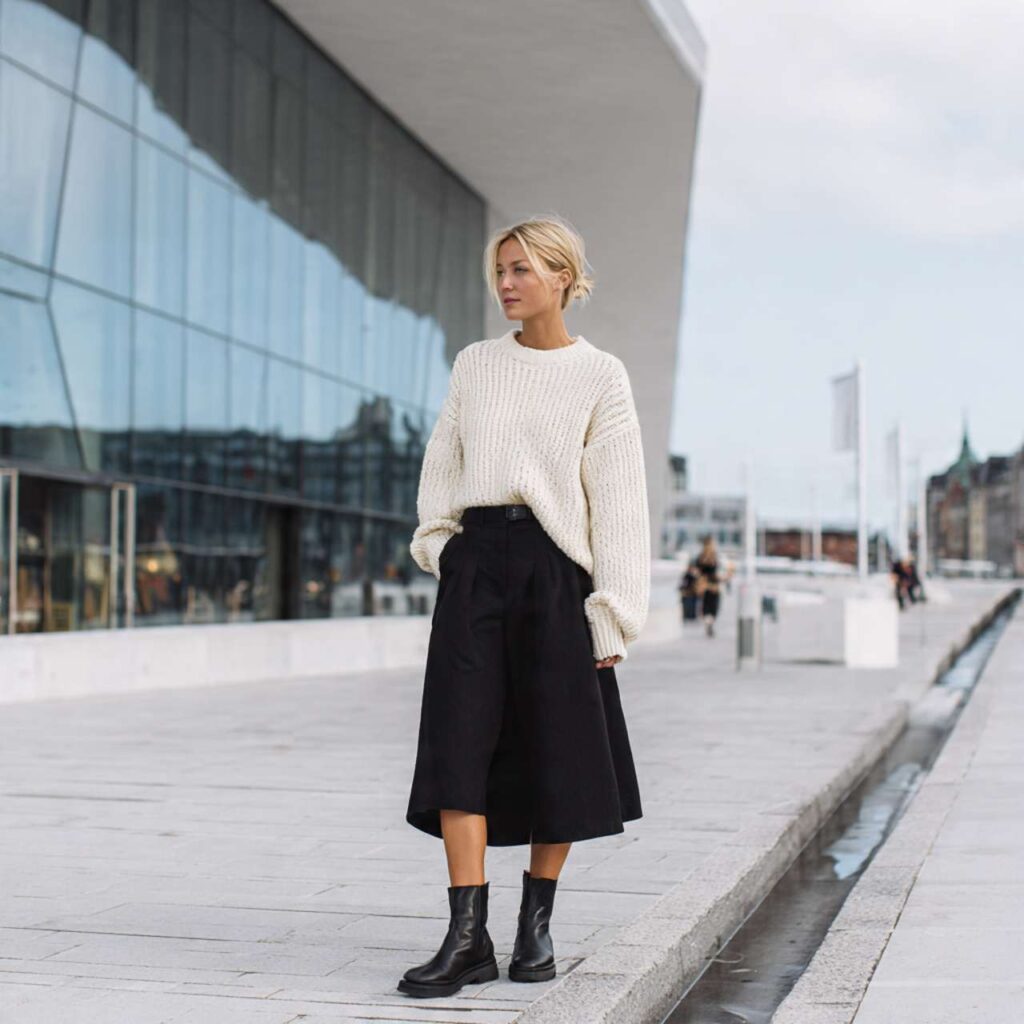 Choose a fitted or semi-fitted silhouette that can tuck easily into pants or skirts. The cream color brightens your complexion during grey winter days and creates beautiful contrast when layered under darker pieces. Style it with high-waisted trousers and loafers for work, or with a pleated midi skirt and boots for weekend sophistication.