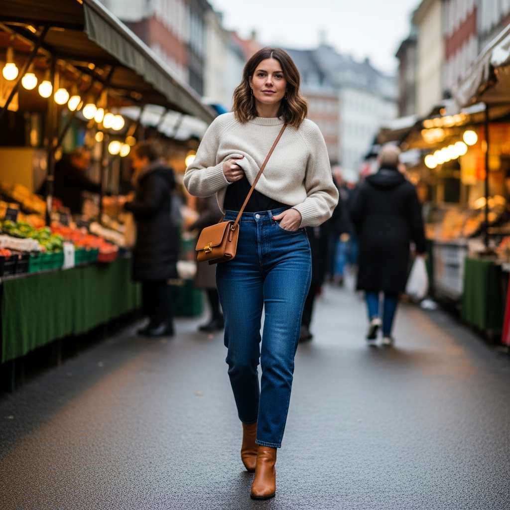 Choose jeans with a high waist and straight or slightly relaxed leg opening. The darker wash feels more sophisticated for winter and pairs seamlessly with boots. These jeans work for everything from coffee runs to dinner dates when styled appropriately. Tuck in sweaters to emphasize the flattering high waist, or leave them untucked for relaxed elegance.