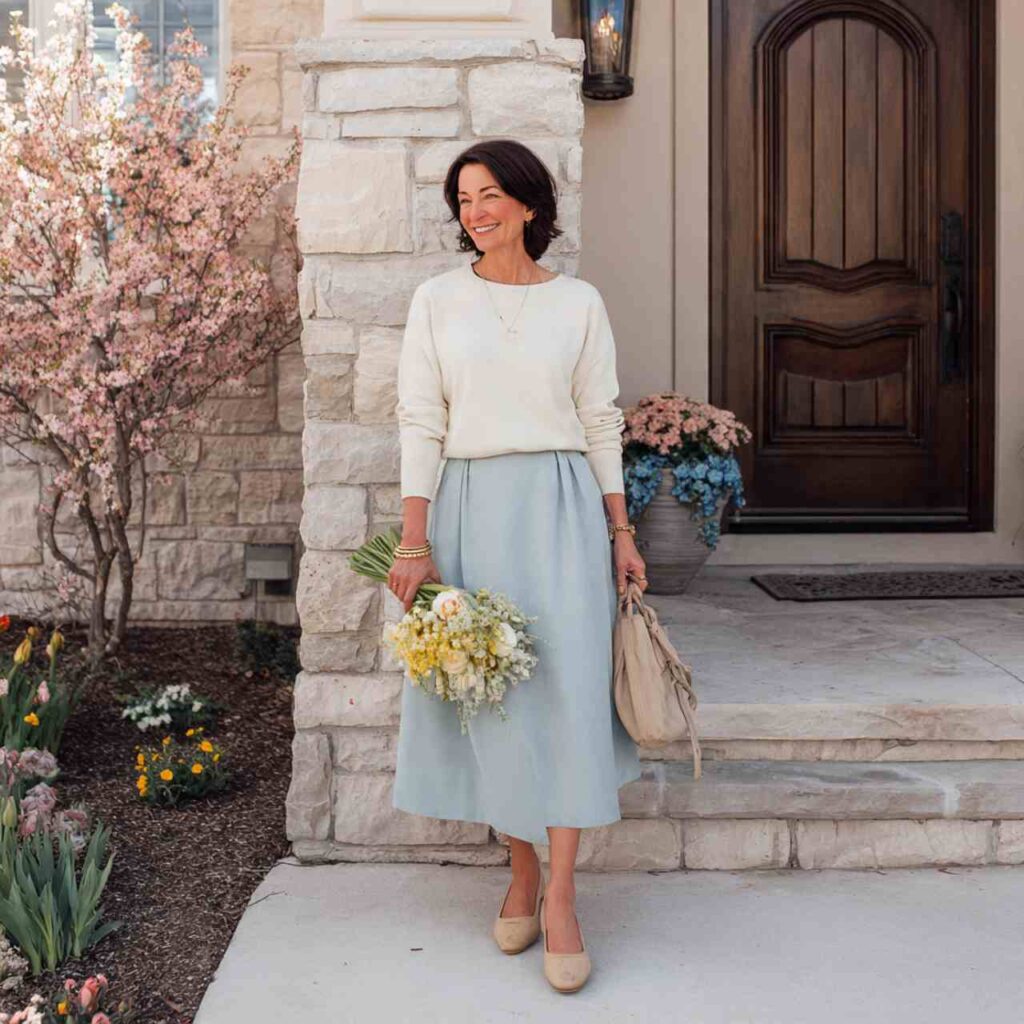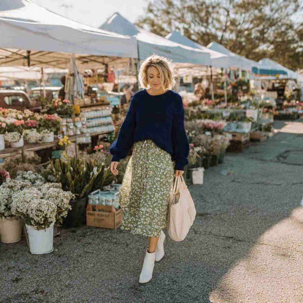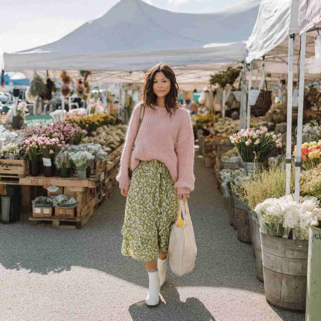 Choose a lightweight crewneck or V-neck sweater in pastels or neutrals. Pair with a flowy midi skirt in a complementary color floral prints or solid shades both work beautifully. Tuck the sweater in loosely at the front for shape. Add ankle boots for cooler moments or switch to flat sandals when it warms up. Throw a denim jacket in your bag just in case. This outfit works for farmers markets, casual lunches, park walks, or relaxed weekend gatherings.