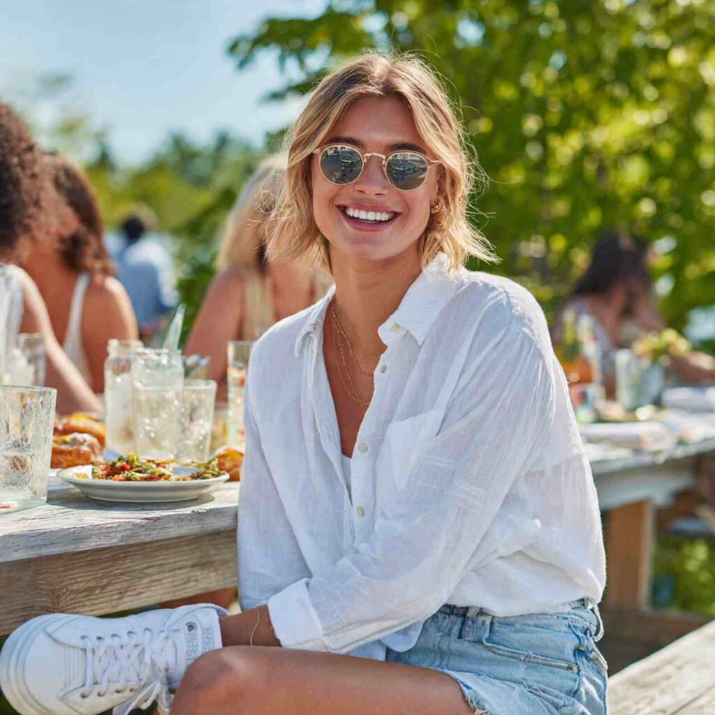 Select a cotton or linen button-up in white, stripes, or soft colors. Pair with denim shorts, khaki shorts, or tailored shorts depending on your vibe. Roll the sleeves to three-quarter length. Leave the shirt unbuttoned over a tank, or button it fully and tuck it in. Add sneakers or sandals. This outfit works for outdoor dining, park activities, weekend markets, or warm spring days.