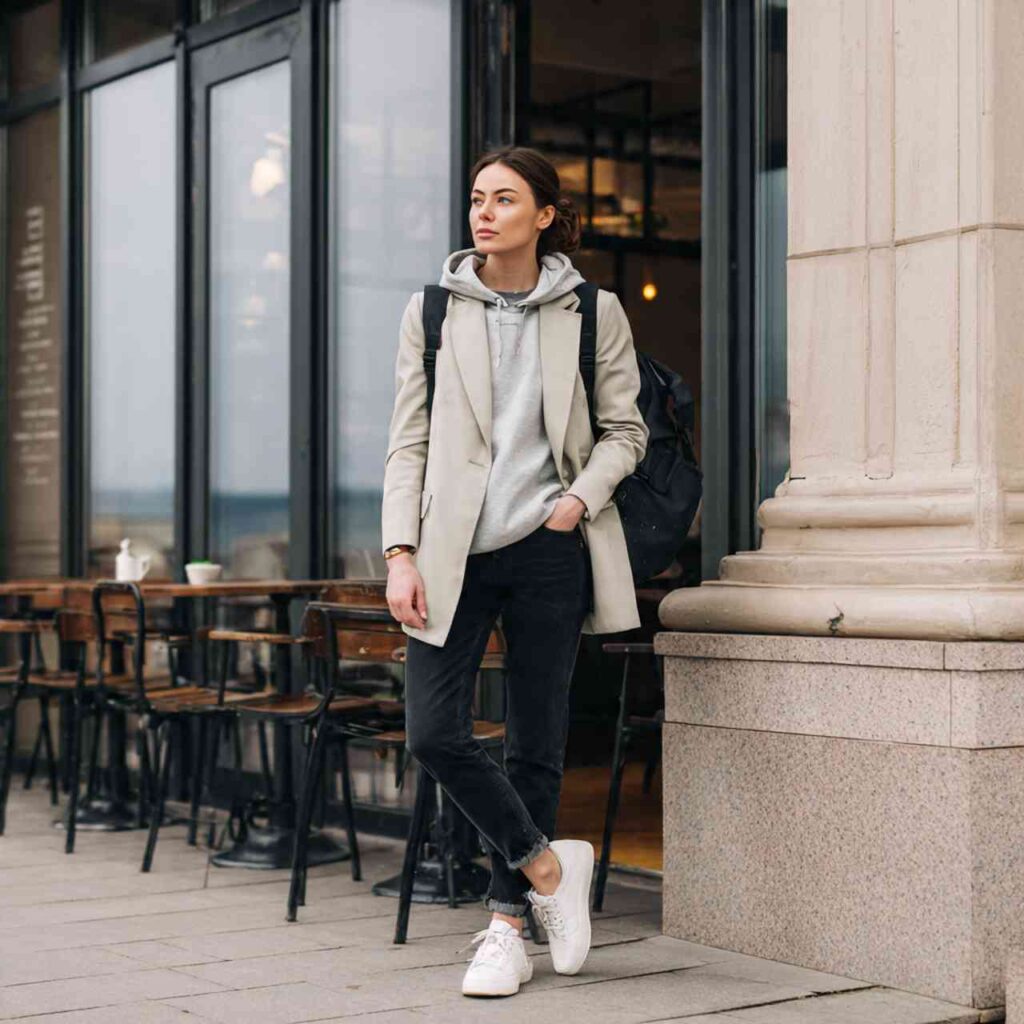 Wear a fitted hoodie in grey, black, or soft pastels under a blazer in a complementary neutral. The contrast between sporty and structured creates interesting tension. Pair with jeans or joggers and finish with sneakers. This outfit works for casual work-related weekend activities, creative events, coffee shop sessions, or any occasion requiring comfort with a bit of polish.