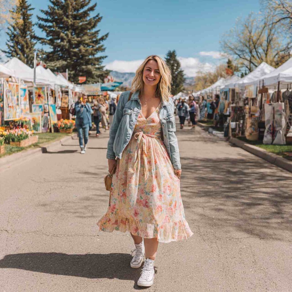 Choose a midi dress in lightweight fabric cotton, viscose, or jersey work well. Florals, solids, or subtle prints all work for spring. Pair with your favorite white or neutral sneakers. Add a denim jacket or cardigan that you can tie around your waist when it warms up. This outfit works for weekend gatherings, outdoor events, casual social plans, or sightseeing.
