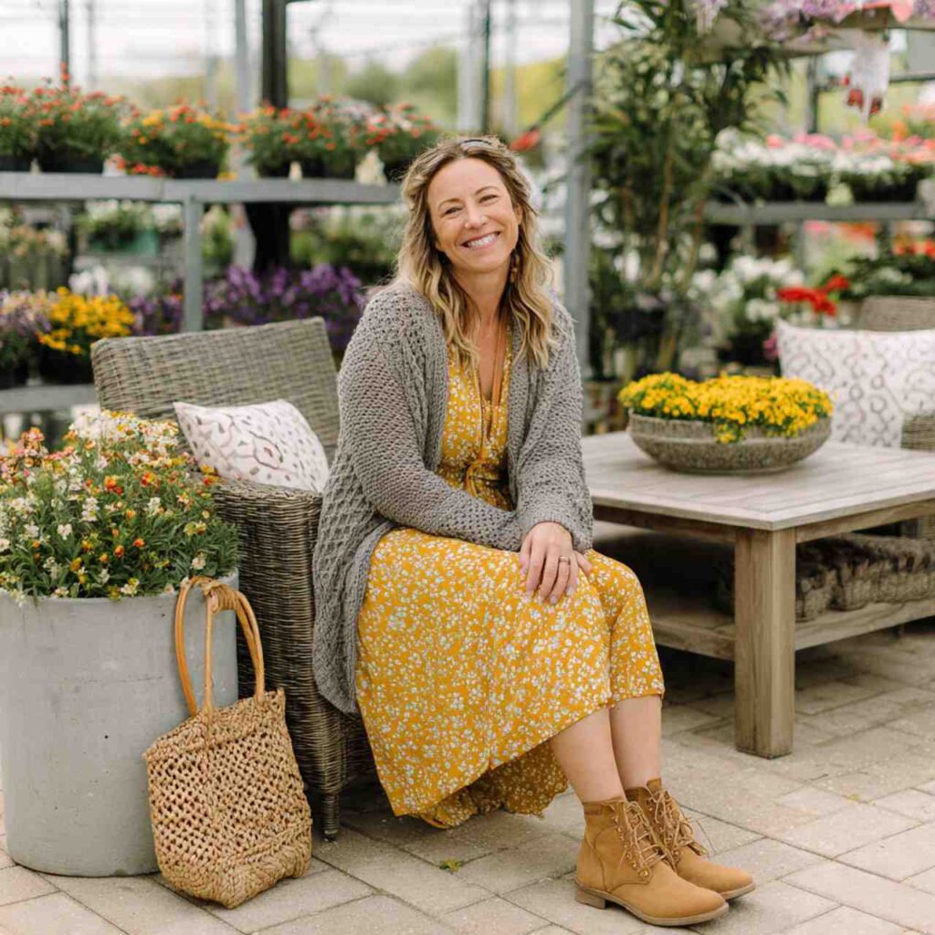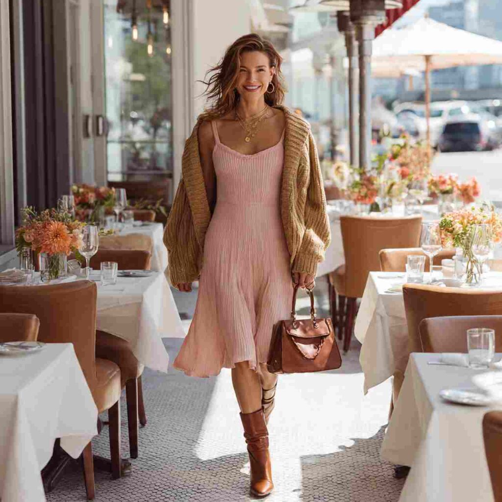 Select a lightweight sundress in florals or solid spring colors. Layer a fitted or boyfriend cardigan over itโ€”leave it unbuttoned for airiness or button it partially for warmth. The cardigan can easily be removed and tied around your waist when the sun comes out. Add ankle boots or flat sandals. This outfit works for weekend gatherings, outdoor events, casual dinners, or spring celebrations.