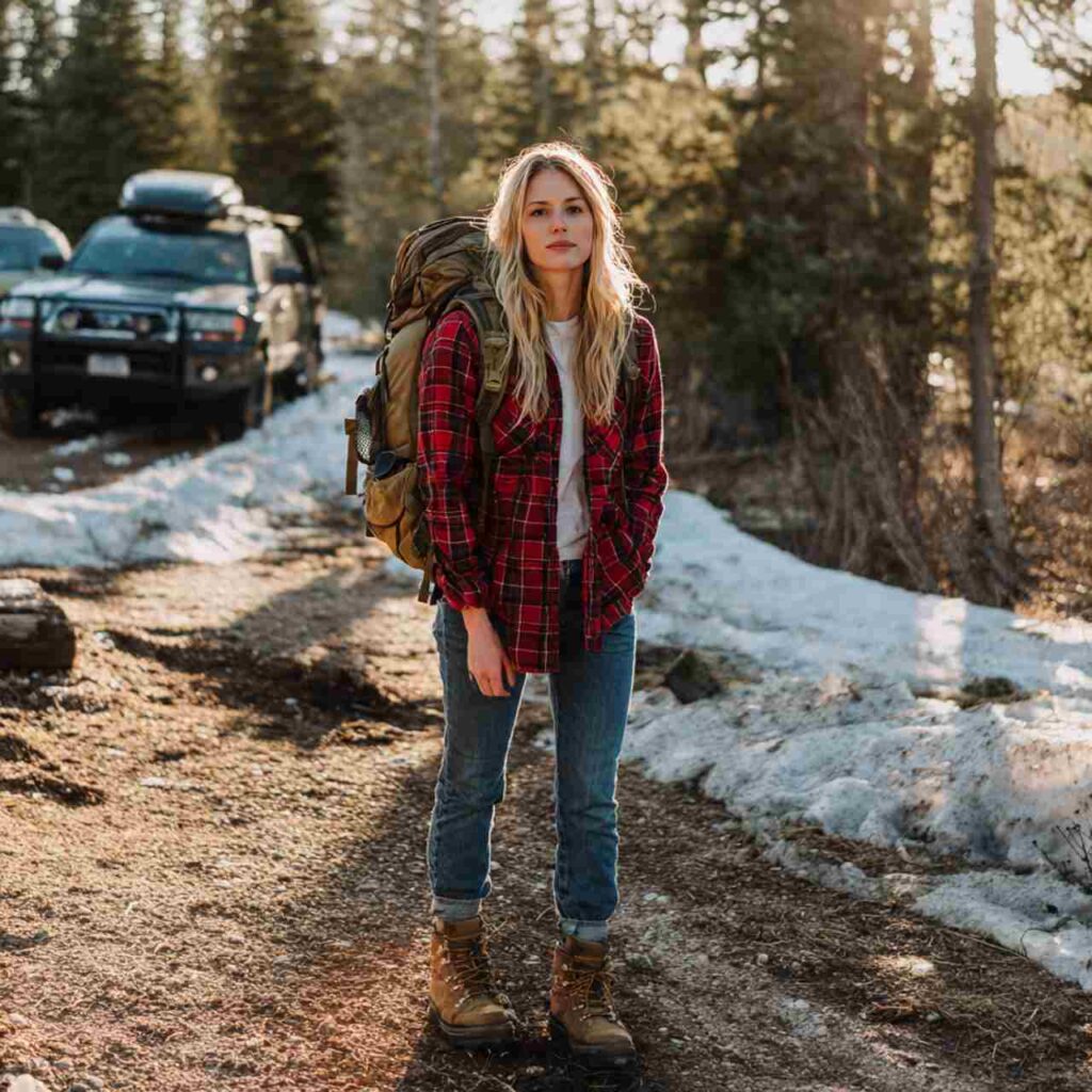 Select a flannel in classic plaid patterns or softer colors. Wear it unbuttoned over a fitted tee in white, black, or grey. Pair with jeans any style that you love. Add boots or sneakers. The flannel provides warmth and can be tied around your waist when not needed. This outfit works for outdoor activities, casual hangouts, errands, or low-key weekends.