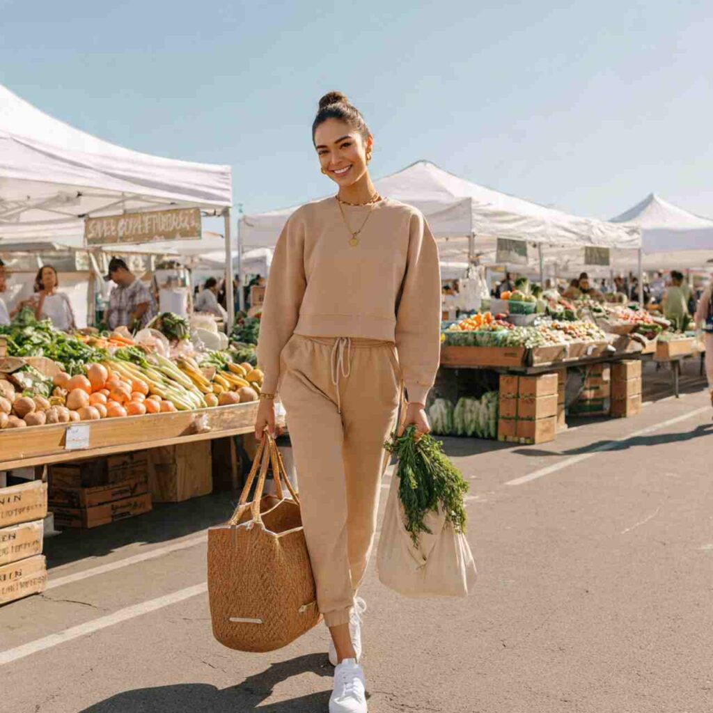 Choose a matching set coordinating pants and top or shorts and hoodie in quality fabric and neutral or soft colors. Add a structured bag, quality sneakers, and minimal jewelry. Layer a denim jacket or blazer if needed. The matching aspect makes it look like an outfit rather than sleepwear. This works for coffee runs, casual meetups, errands, or relaxed weekend activities.
