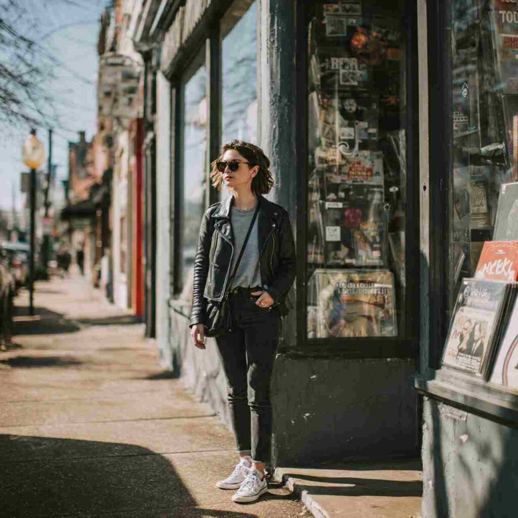 Wear a leather jacket black, brown, or burgundy over simple base outfits. Try it with a sundress and ankle boots, over a tee and jeans with sneakers, or layered over a hoodie with leggings. The jacket adds instant style while providing practical warmth. This outfit works for virtually any casual weekend scenario from daytime to evening.