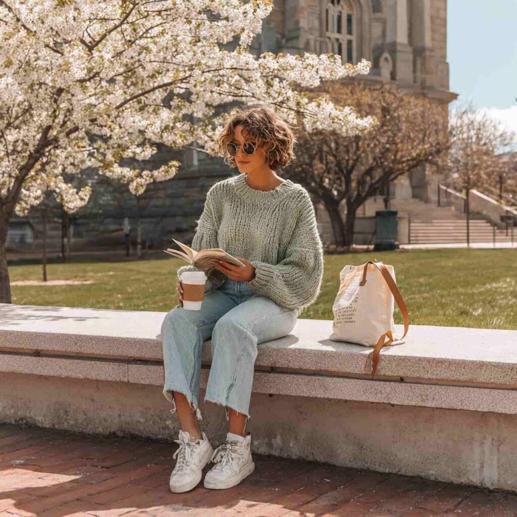 Choose boyfriend or relaxed-fit jeans in light to medium washes. Pair with a slightly oversized cozy sweater in spring-appropriate weights and colors. Tuck the front in loosely or leave it untucked. Add sneakers or loafers. This outfit works for coffee dates, bookshop browsing, movie outings, or any relaxed weekend plan.