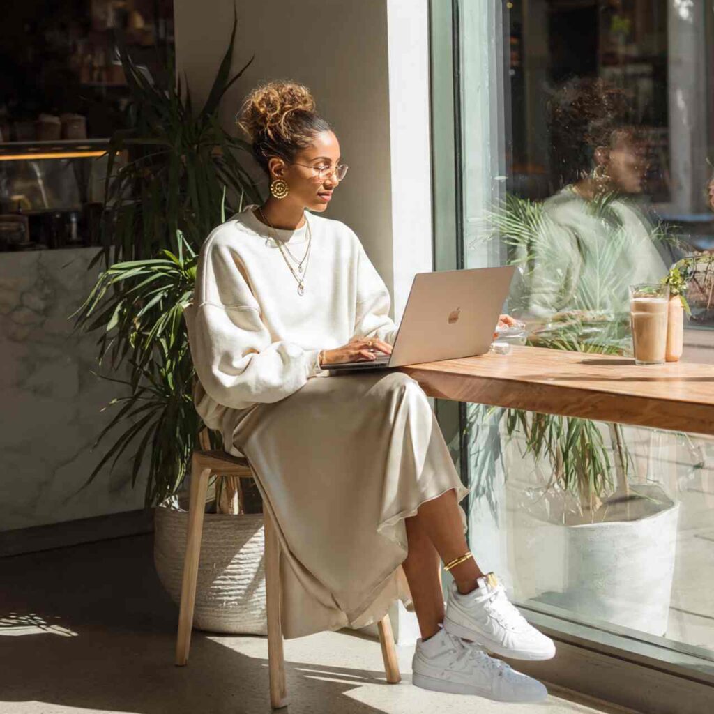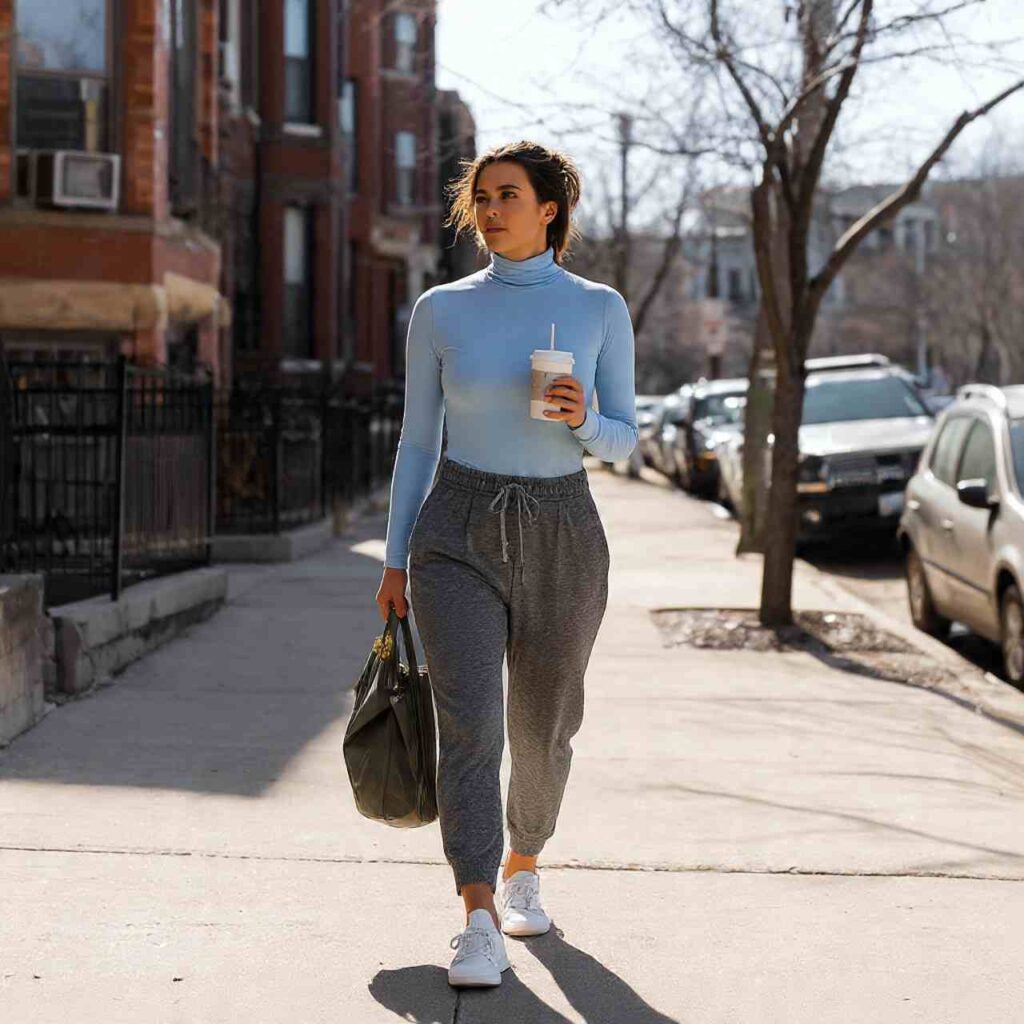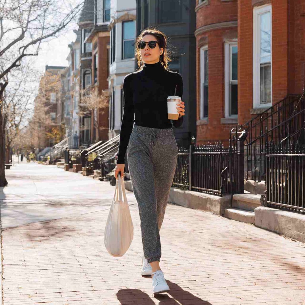 Choose elevated joggers in neutral colorsโ€”black, grey, camel, or navy work beautifully. Pair with a fitted turtleneck in a complementary shade to balance the relaxed bottoms. Add a blazer if you’re feeling fancy, or a denim jacket for casual vibes. Complete with sleek sneakers or loafers. This outfit works for casual brunches, coffee dates, errands, or working from cafes.