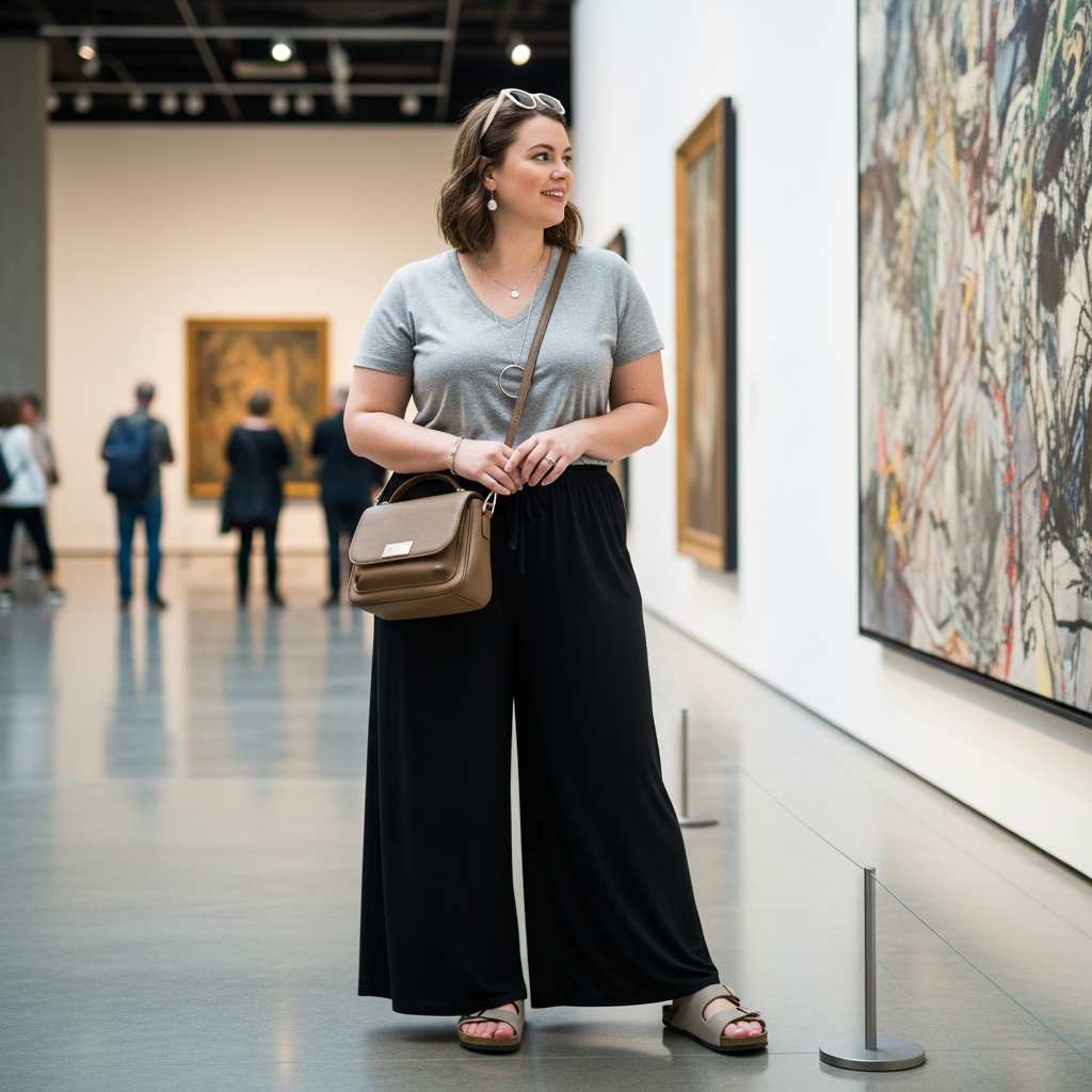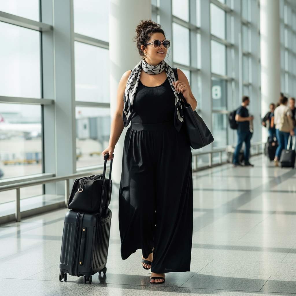 Wide-leg palazzo pants in a breathable fabric like linen or rayon offer comfort and style. Choose black or a neutral tone that pairs with everything. The wide leg provides airflow while the elastic or drawstring waist ensures comfort during long travel days.