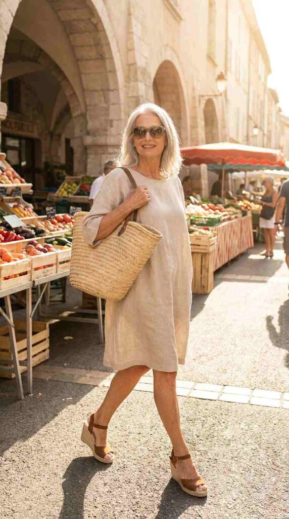 A straight-cut linen dress with espadrille wedges creates breezy warm-weather elegance.